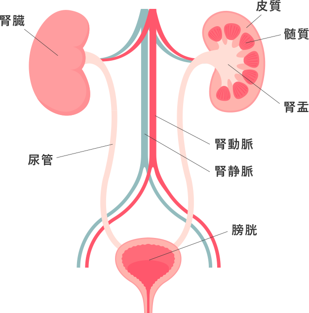 だからこそ生体腎移植ができるわけです。全身を巡った血液は腎臓で老廃物を濾過します。老廃物は腎盂に集められ、尿管を経由して膀胱に送られます。
