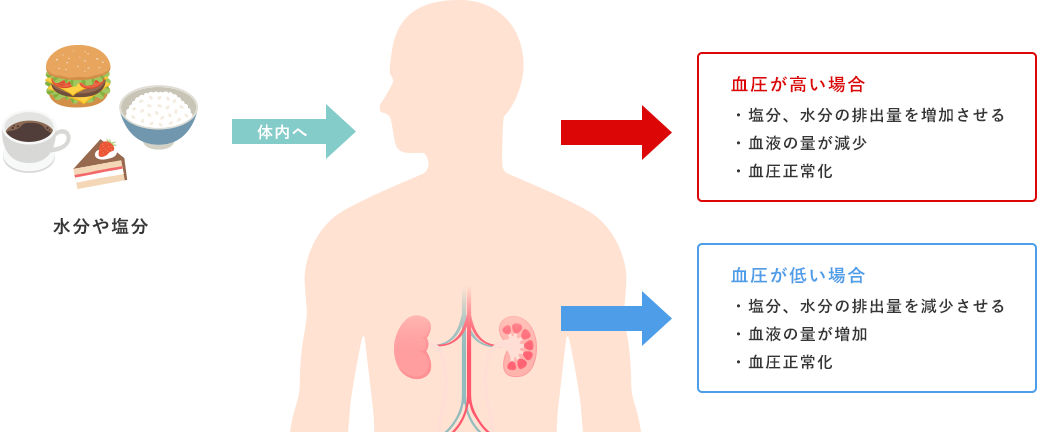 実は腎臓には水分と塩分の排泄量を増加したり減少したりすることで、血圧を調整する機能があります。
