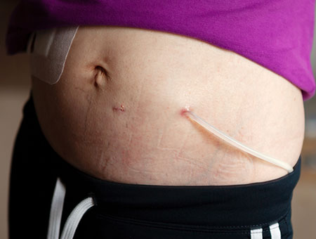 手術によっておへその脇に穴を開けて腹腔へカテーテルを通し、そこから透析液を腹腔に溜めます。
